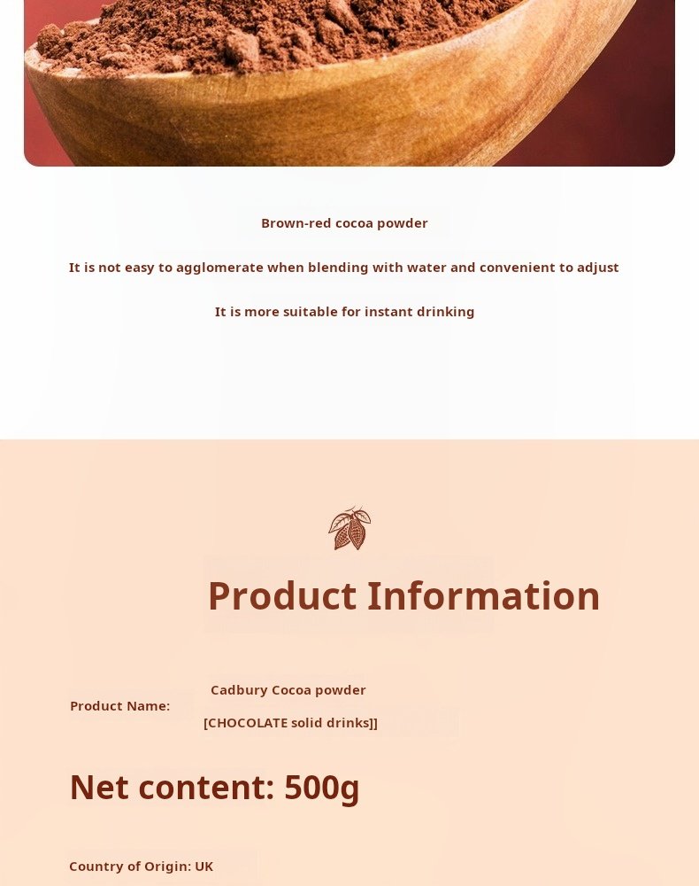 | Additives | Cadbury chocolate flavor, Fat-Reduced Cocoa Powder, MILK Chocolate, Cocoa BUTTER |